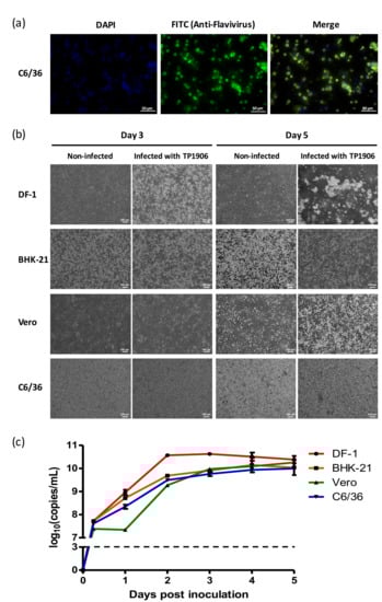 C6/36, Vero, BHK-21 and DF-1 cell lines were obtained from the American Type Culture Collection (ATCC; www.atcc.org) and used for the viral growth kinetics assays. C6/36 cells were grown in RPMI1640 medium supplemented with 5% fetal bovine serum (FBS) (Gibco, Invitrogen, Carlsbab, CA, USA), 100 units/mL–0.1 mg/mL–0.25 μg/mL penicillin-streptomycin-amphotericin B (PSA) (Gibco, Invitrogen), 1X non-essential amino acids (NEAA) (Gibco, Invitrogen) and incubated in 5% CO2 at 30 °C. Vero cells were grown in M199 medium supplemented with 5% FBS-PSA-NEAA and incubated in 5% CO2 at 37 °C. BHK-21 cells were cultured in MEM medium supplemented with 4% FBS-PSA-NEAA and incubated in 5% CO2 at 37 °C. DF-1 cells were cultured in DMEM medium supplemented with 10% FBS-PSA in 5% CO2 at 39 °C. Growth curves were performed by inoculating 0.1 mL TMUV-TP1906 (3.12 × 108 viral copies) into 80% confluent cells (5 × 105 cells per well) in 6-well plates (Corning, NY, USA). After 1 h incubation, medium with virus was removed and added 3 mL of fresh medium. All cell culture supernatants were collected at 0, 6, 24, 48, 72, 96 and 120 h post infection and the cell cultures were observed daily for cytopathic effect under a light microscopy (Carl Zeiss, Oberkochen, Germany). The viral RNA extracted from the supernatants was quantified by real time RT-PCR with the flavivirus-specific primer set and the viral copy number calculated according to the standard curve. All experiments were performed in triplicate.