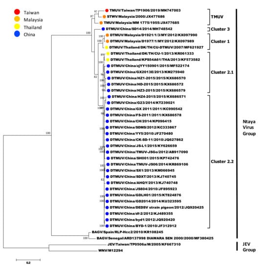 To understand the phylogenetic relationship between TMUV-TP1906 and other mosquito-borne flaviviruses, the complete ORF sequences of 40 representative flaviviruses, namely 36 TMUVs (listed in Table 2), Bagaza virus (GenBank numbers: KR108245 and MF380425), Japanese encephalitis virus (GenBank number: KF667310) and West Nile virus (GenBank number: M12294), were analyzed. Phylogenetic analysis indicated that TMUVs could be divided into two lineages (lineages TMUV and DTMUV). The TMUV lineage contained TMUV-MM1775, STWV, and TMUV-TP1906, and TMUV-TP1906 was most closely related to STWV. The DTMUV lineage could be further grouped into three clusters (clusters 1 to 3) (Figure 3). Cluster 1 contained DTMUV strains from Malaysia and Thailand. Clusters 2.1 and 2.2 contained many avian DTMUV strains found in Thailand and China. DTMUV-SD14 isolated from mallards (Anas platyrhynchos) in China was classified into cluster 3.