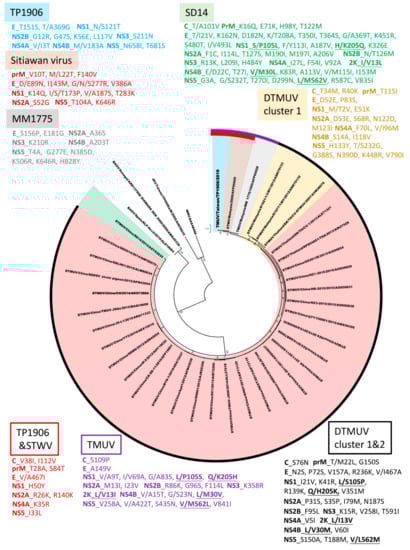 Phylogenetic analysis based on the complete ORF of TMUVs showed that TMUVs can be divided into two lineages, TMUV and DTMUV. Analysis of amino acid sequences showed that there are 22 amino acid substitutions unique to the TMUV lineage and 29 amino acid substitutions unique to cluster 1 and cluster 2 of the DTMUV lineage (Figure 4). The DTMUV-SD14 strain which belongs to cluster 3 of the DTMUV lineage, could be considered as a transitional group between the TMUV lineage and clusters 1 and 2 of the DTMUV lineage. The DTMUV-SD14 strain contains 48 amino acid mutations, which are different from other TMUVs. In addition, there are five informative amino acid substitutions (NS1-105, NS1-205, 2K-13, NS4B-30 and NS5-562) for the differentiation of the TMUV lineage, DTMUV-SD14 (cluster 3 of the DTMUV lineage) and clusters 1 and 2 of the DTMUV lineage. The TMUV lineage contains three virus strains, the TMUV-MM1775 prototype strain, STWV, and TMUV-TP1906. TMUV-MM1775 has not been documented as a pathogen in birds or other animals; however, STWV, which is most closely related to TMUV-TP1906, causes encephalitis and retards the growth of chicks. Analysis of amino acid sequences showed that TMUV-TP1906 contains 12 unique amino acid substitutions compared with other TMUVs. In addition, comparison of protein sequences of TMUV-TP1906 and STWV with other TMUVs showed 10 amino acid substitutions. These informative amino acid positions may be useful for the classification of TMUVs and may play crucial roles in the evolution and protein function of TMUVs.