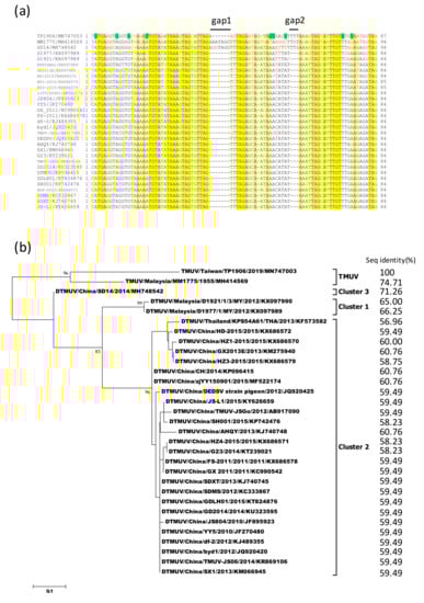 Comparison of 5′-UTR and 3′-UTR sequences between TMUV-TP1906 and other TMUVs showed 90.43%–94.68% and 89.28%–95.15% sequence similarities, respectively (Table 4). Analysis of 3′-UTR variable region (VR) sequences (lengths varied from 84 to 94 nucleotides) between TMUV-TP1906 and other TMUVs showed that TMUV-TP1906 contained 1 gap (gap 1) and DTMUVs contained 2 gaps (gaps 1 and 2), while no gaps were found in the VR sequences of TMUV-MM1775 and DTMUV-SD14 (Figure 5a). The novel TMUV-TP1906 had a 3 nucleotide insertion in gap 2 and a nucleotide insertion in gap 1. In addition, there were nine unique nucleotide substitutions in the VR of TMUV-TP1906 compared with those of the other TMUVs. The 3′-UTR VR sequences were more consistent among cluster 2 of the DTMUV lineage, but more variable in the TMUV lineage and clusters 1 and 3 of the DTMUV lineage (Figure 5b). Comparisons of the 3′-UTR VR sequence of TMUV-TP1906 with those of TMUV-MM1775, DTMUV-SD14 (cluster 3), DTMUV-D1921 (cluster 1), and DTMUV-D1977 (cluster 1) showed 74.71%, 71.26%, 65.00%, and 66.25% sequence similarities, respectively, and 56.96%–60.76% sequence similarity with cluster 2 of DTMUVs. Figure 5b shows the phylogenetic tree based on the 3′-UTR VR sequences of TMUVs, and the overall topology was similar to the phylogenetic tree based on analysis of ORF sequences (Figure 3).