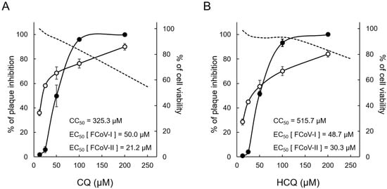 FIP is a fatal coronaviral infection of cats. Several drugs have been identified aiming at the treatment of FIP, but no commercial drugs can be used to treat FIP by veterinarians. We have searched for a drug applicable to treat FIP among commercial drugs [,]. CQ is an antimalarial drug and improved symptoms of cats with FIP []. However, increased liver enzymes were observed in some cats treated with CQ. Increased liver enzymes are observed in cats with FIP, but the possibility of CQ-induced liver disorder was also suggested. If there is a drug with cytotoxicity weaker than that of CQ that exhibits comparable antiviral effects, it may be applicable as a therapeutic drug for FIP. We focused on HCQ, which is 4-aminoquinoline similar to CQ []. The cytotoxicity of HCQ has been reported to be lower than that of CQ in mouse, rat, and dog []. In addition, HCQ has been demonstrated to have antiviral effects on SARS-CoV-2 infection equivalent to those of CQ in vitro [].
