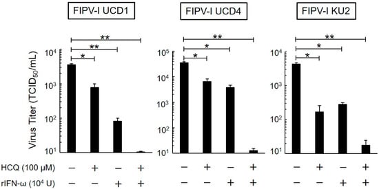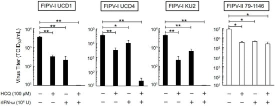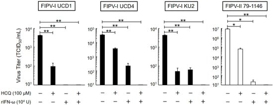 Effects of 24-h exposure on antiviral activity of HCQ and recombinant feline interferon-ω (rfIFN-ω). Virus titer of FIPV-infected fcwf-4 cells pre-treated with HCQ (100 μM) and rfIFN-ω (104 U/mL) for 24 h. The results are shown as the mean ± SE. Data represent four independent experiments. ** p < 0.01 (* p < 0.05) vs. untreated (pre-treated with medium only).