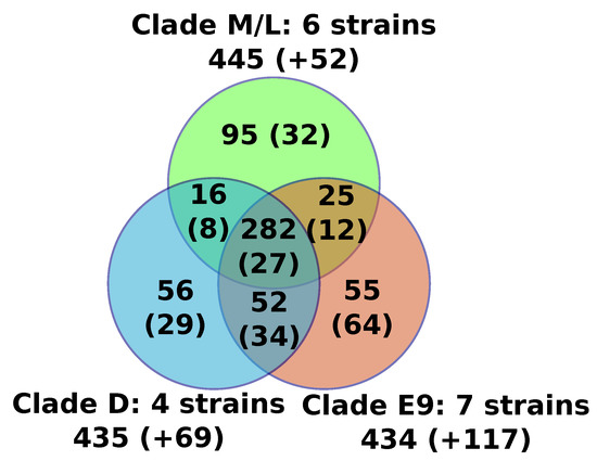 Venn diagram of the numbers of protein families shared between FV clades. For each area of the diagram, the number of protein families ubiquitously conserved in all of the FVs of the corresponding group is indicated. Numbers in brackets indicate additional protein families that were only conserved in a subset of FVs from the relevant group. The names of the FV strains contained in each clade are detailed in Figure 2.