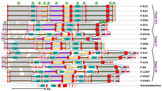 A phylogenetic tree reconstructed using the DNA polymerase protein recovered the previously reported phylogenetic position of FVs as a sister group to PV [11] and allowed the identification of the root of the FV clade (Figure 2a). Out of the 282 core proteinfamilies, 267 were encoded by a single-copy gene in every genome and were used to infer the detailed evolutionary relationships between FVs. The resulting phylogenetic tree recovered three main clades, namely E9, D and M/L (Figure 2b); five of the newly sequenced FVs isolated from sewage and lake samples collected in France and Algeria belonged to clade E9, containing other FVs sampled in the south of France; F-VV10, also isolated from Algerian sewage, grouped in clade D, containing other FV strains from Senegal. The overall level of nucleotide similarity between the single-copy core gene coding sequences is high within each clade, typically ranging between 92% and 100% (Figure S1a). The similarity between clades E9 and D is in the order of 70.5% and is 64.5% between E9/D and M/L. The 100% average nucleotide similarity observed between the core genes of the two newly sequenced F-VV57 and F-VV63 strains, both isolated from Algeria, raises the question of a possible contamination by the same virus. However, we found 52 substitutions between the two genome assemblies outside of the core genes plus four large indels totaling 1795 bp (Figure S1b), which ruled out the contamination hypothesis. Two other sets of previously sequenced FVs (i.e., [F-D5b, F-D6] and [F-D5a, F-E12, F-E23, F-E24]) also shared 100% overall similarity between their single-copy core genes. The numbers of genome-wide nucleotide substitutions and the numbers of gapped positions eliminated the hypothesis of contamination for two of them (F-D5b and F-D6: 73 substitutions and 1141 gapped positions). By contrast, the very small number of differences between F-E23 and F-E24 (1 substitution and 0 gapped positions) and between F-E12 and F-D5a (1 substitution and 1 putative insertion of 61 bp at the end of the F-D5a contig) suggested that these strains were either extremely close or identical.
