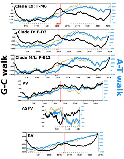 The same compositional analysis was performed for viruses closely related to FVs, including—by increasing phylogenetic distance—Pacmanvirus (PV), ASFV and Kaumoebavirus (KV). The amplitudes of the respective curves were comparable to those of the FV genomes, except for the KV curves, which were always greater. For both the G-C walk and the A-T walk analysis, the curve shapes were considerably dissimilar between viruses, with the exception of KV for which the G-C walk produced a W-shape similar to the corresponding curves in FVs, with three maxima co-locating on the chromosome extremities and the MCP gene.
