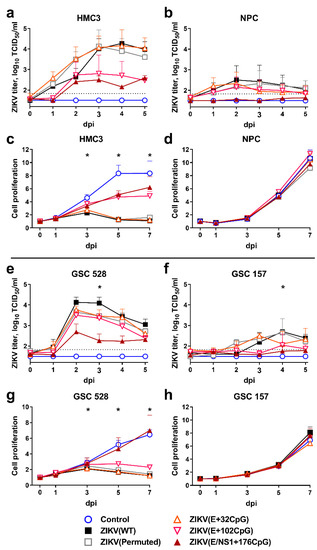 3.1. CpG-Recoded ZIKV Variants Show Reduced Infection Kinetics in Nonmalignant Human Brain Cells and Distinct Oncolytic Activity in Different Glioblastoma Stem Cells in Vitro
