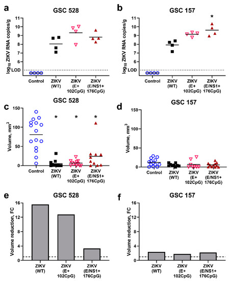 - Chen, Q.; Wu, J.; Ye, Q.; Ma, F.; Zhu, Q.; Wu, Y.; Shan, C.; Xie, X.; Li, D.; Zhan, X.; et al. Treatment of Human Glioblastoma with a Live Attenuated Zika Virus Vaccine Candidate. MBio 2018, 9, 1683–1701. [Google Scholar] [CrossRef] [PubMed]