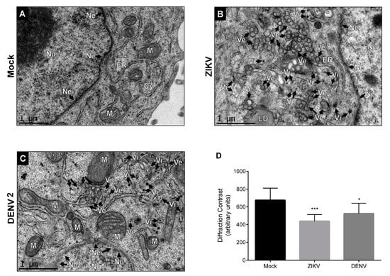 Zika virus (ZIKV) infection induces challenge in envelope nuclear in Huh-7 cells. Transmission electron microscopy of (A) mock-infected cells or (B) infected cells with ZIKV and (C) dengue virus (DENV 2) for 24 h. (D) The graphs represent the results of diffraction contrast expressed as arbitrary units and the error bars show the SD of three independent experiments. * p ≤ 0.05; *** p ≤ 0.001, n = 10 per group. Ne, nuclear envelope; Nu, nucleus; ER, endoplasmic reticulum; VE, double-membrane vesicles; LD, lipid droplets.