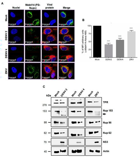 Since the Mab414 antibody detects several Nups harboring the FG repeats, the next step was to analyze the integrity of specific Nups that are involved in RNA and protein transport through the NPC by Western blotting. Interestingly, at 24 hpi with DENV2 and DENV4, an important reduction in the amount of Nup153, Nup98, and Nup62 but not TPR was observed (Figure 2C). In contrast, at 24 hpi with ZIKV, a significant reduction in the amount of TPR, Nup153, and Nup98, but not in the amount of Nup62, was observed (Figure 2C). These results strongly suggest that DENV and ZIKV infection induced the cleavage/degradation of some Nups involved in the nuclear-cytoplasmic transport, in that Nup153 and Nup98 were altered in both DENV and ZIKV infection [43].