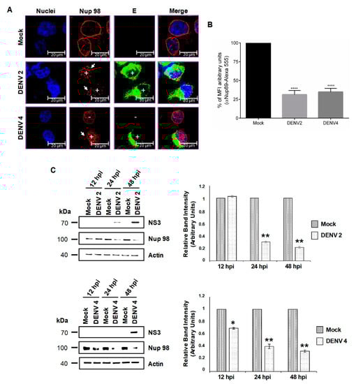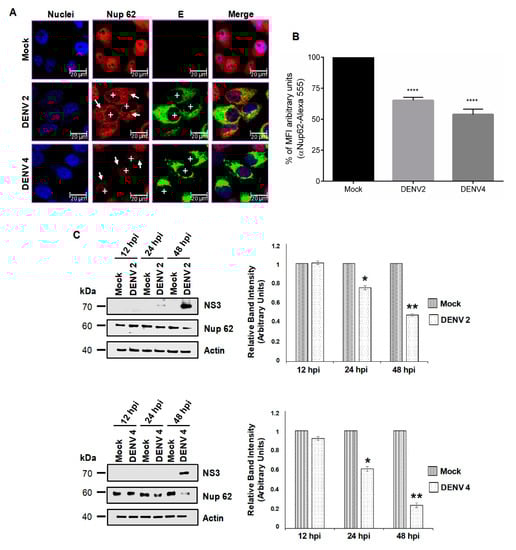Using a specific anti-Nup62 antibody, we detected a homogenous distribution of this protein in the nucleoplasm of mock-infected cells as expected [45] (Figure 3A). However, in DENV2- and DENV4-infected cells, a significant reduction in the amount of the protein in the nucleoplasm and in MFI to DENV 2 (34.9% ± 2.5% reduction of MFI) and DENV 4 (46.2% ± 4.3% reduction of MFI) was observed at 48 hpi, without any presence in the cytoplasm (Figure 3A,B). To confirm the results, the expression levels of Nup62 during DENV and ZIKV infection were analyzed by Western blotting at different times post-infection. A slight reduction of 22% and 31% in the expression levels of Nup62 was detected at 24 hpi in cells infected with DENV2 and DENV4, respectively. The reduction in the expression levels of Nup62 at 48 hpi was more prominent (52% and 71% respectively) in both DENV serotypes (Figure 3C).