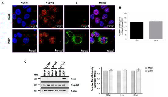 In contrast, the nuclear localization and abundance of Nup62 in ZIKV-infected cells were not altered, as observed by confocal microscopy (Figure 4A,B). In concordance with these results, the amount of Nup62 determined by Western blot assay was not modified at 12, 24, and 48 hpi in cells infected with ZIKV (Figure 4C).