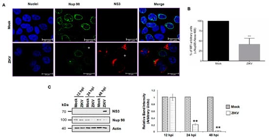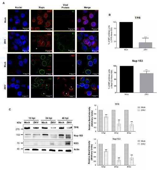 Since the integrity of Nups during infection of viruses from the same family do not always result in the degradation of the same nucleoporins [38,46], we wanted to determine if, in contrast to what occurs in DENV-infected cells (Figure 2B), TPR was altered during ZIKV infection. Therefore, TPR distribution and abundance were evaluated in ZIKV-infected cells. While the anti-TPR staining was observed around the nucleus and in the nucleoplasm of mock-infected cells, this staining was almost abolished in ZIKV infected cells (Figure 7A,B, upper panel). This reduction in the TPR levels was confirmed by Western blot, where up to 70% reduction in protein levels at 48 h post-ZIKV infection was obtained (Figure 7C).