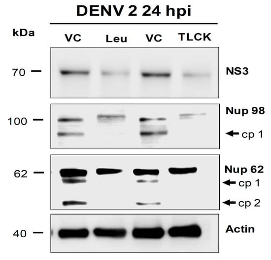 Huh-7 cells grown in 2.3 × 105 cells/plate were infected with DENV 2 at an MOI of 3 for 8 hrs. Cells were incubated with two different serine protease inhibitors (Leupeptin 1 µM or TLCK.HCl 150 µM) for 24 hrs. Cells were lysed and the integrity of the Nups was analyzed by Western blot assay using 60 μg of protein.