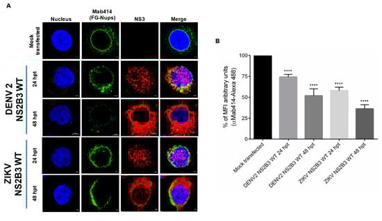 Huh-7 cells grown on slides were transfected or not with NS2B3 or NS2B3-S135A from DENV or ZIKV, or infected or not with DENV2, DENV4, or ZIKV at an MOI of 3. Cells were treated with permeabilizing solution (serum 1%, saponin 2mg/mL in PBS) for 20 min at RT. Cells were incubated with 1 µg/mL of either rabbit anti-NS5 protein, rabbit anti-NS3 protein, or mouse anti-E protein (4G2) antibodies. Nucleoporins were detected using the antibody Mab414 (Abcam) directed to the FG-Nups (Nup62, Nup58, Nup54, Nup98, Nup45, Nup214, hCG1, Nup153, and Nup50) [41], or specific anti-Nup62, anti-Nup98, anti-Nup153, or anti-TPR in permeabilizing solution overnight at 4 °C. Cells were incubated with 1 µg/mL of AlexaFluor 488-conjugated donkey anti-mouse IgG, AlexaFluor 555-conjugated goat anti-rabbit IgG, AlexaFluor 555-conjugated mouse anti-goat IgG, or AlexaFluor 488-conjugated anti-rabbit IgG. Nuclei were stained with Hoechst (Santa Cruz Biotechnology, Santa Cruz, CA) or DAPI. Slides were observed in a Zeiss LSM700 laser confocal microscope (Germany) or in a Leica TCS SP8 (Germany) as indicated. The images obtained were processed with Leica Application Suite X Core Offline software (Germany).