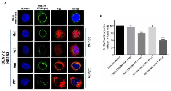 To further confirm the participation of the protease activity of NS23 in the FG-Nups degradation, cells were transfected for 24 and 48 h with the DENV NS2B3-S135A mutant, which lacks the protease activity (Figure 10). The expression of this mutant protease did not alter the distribution and integrity of the FG-Nups, in comparison to the alterations observed when the WT protease was transfected, confirming that the protease activity of NS2B3 is required for the FG-Nups degradation (Figure 10A,B). Both the WT and mutant proteases were observed with a nuclear-cytoplasmic distribution at 24 hpt, while a predominantly cytoplasmic distribution was observed at 48 hpt.