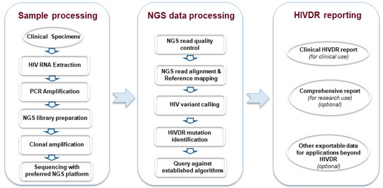 NGS HIVDR assays are multiprocedural processes consisting of many quality control (QC) checkpoints to ensure high data quality. They need both well-developed protocols for sample processing in the laboratory, and sophisticated bioinformatics pipelines for automated data processing, unbiased, correct identification of HIV DRMs, and actionable HIVDR reporting (Figure 1). Laboratory procedures involve the extraction of HIV viral RNA, reverse transcription-polymerase chain reaction (RT-PCR) amplification to convert viral RNA into complementary DNA and enrich the target HIV templates, NGS library preparation, and DNA sequencing with the NGS platform of choice. Thus far, many NGS laboratory protocols have been developed and/or published by different groups in varied contexts. Expectedly, significant variations exist among such protocols, especially in regard to in-house developed assays. Likewise, NGS HIVDR data analysis is a complex process involving large volumes of raw data that need to be analyzed for read QC, reference mapping, variant calling, DRM identification, HIVDR interpretation and reporting, and generation of other exportable data (i.e., consensus sequence) for relevant downstream applications. Many such bioinformatics pipelines have also been developed, some publicly available while others proprietary from commercial sources [45]. Despite these advances, most laboratory protocols and pipelines were developed by independent groups with minimal intercommunication among them, and validated using strategies selected by the developers, as no consensus or guidelines for validation are available. These knowledge and technical gaps can inevitably create difficulties for performance assessment of NGS HIVDR protocols, making comparisons among different platforms and methods difficult. Standardization of both molecular and bioinformatics strategies for NGS HIVDR testing is urgently required for the operationalization and general implementation of such assays in routine practice.