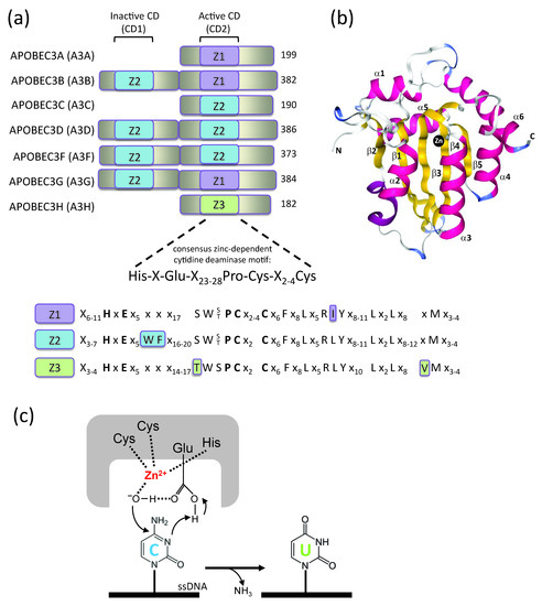 There are 11 members of the human APOBEC family of genes, which arose by gene duplication, including activation-induced cytidine deaminase (AID), APOBEC1 (A1), APOBEC2 (A2), seven APOBEC3s (hereafter referred to as A3 proteins or A3A, A3B, A3C, A3D, A3F, A3G, A3H), and APOBEC4 (A4) [4]. AID plays a significant role in somatic hypermutation and antibody diversification by class-switch recombination of immunoglobulin genes [5,6]. A1 is responsible for C-to-U editing of the apolipoprotein B transcript at position C6666 and changing a glutamine codon (CAA) to a (UAA) translational stop codon. The cytidine deamination results in the synthesis of the truncated apoB-48 protein, which is important for absorption and transportation of dietary lipid from the small intestine to the liver [7,8]. Currently, the functions of A2 and A4 are still unknown [9,10]. The seven homologous members of the A3 family of proteins all encode a conserved zinc-dependent cytidine deaminase domain (CD) with A3A, A3C, and A3H containing a single cytidine deaminase domain (CD) and A3B, A3D, A3F, and A3G containing a catalytically inactive (CD1) and a catalytically active (CD2) cytidine deaminase domain [4] (Figure 1a). The CDs are organized into three distinct groups based on their homologies, named zinc-coordinating domains Z1, Z2, and Z3 [11,12]. The N-terminal CD1 of A3 proteins A3B, A3D A3F, and A3G are catalytically inactive and function to bind RNA and ssDNA [13,14,15]; they also play a role in the oligomerization of A3 proteins and facilitate processive movement of the A3 proteins on the template to increase the efficiency of cytidine deamination [16,17,18,19]. In addition to sharing their evolutionary origins, the CDs of the A3 family of proteins share fundamental structural homology (Figure 1b). A3 CD domains are composed of five β strands and six α helices centered around a deaminase core with a zinc co-ordinating atom.