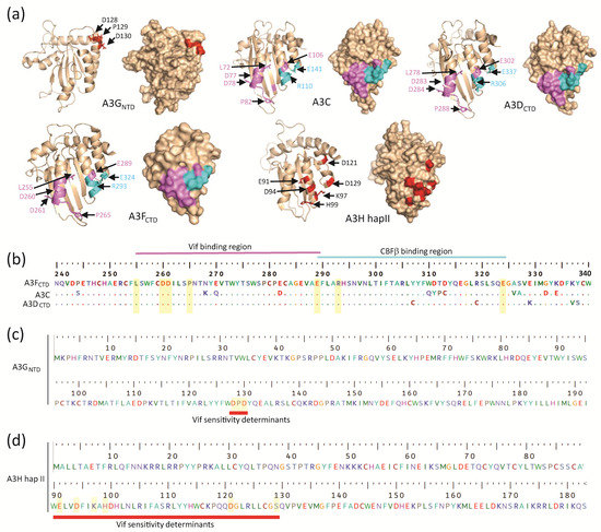 Comparison of A3GNTD, A3C, A3DCTD, A3FCTD, and A3H hap II structures. (a) Cartoon and surface representations of the structure of A3GNTD (PDB: 2MZZ), A3C (PDB: 3VOW), and A3DCTD (a predicted model generated through homology modeling based on the A3FCTD structure (PDB: 6NIL) by using the Phyre2 web portal for protein modeling, prediction and analysis [140], and A3H hap II (PDB: 6BBO). The known Vif-mediated degradation determinants labeled in red (for A3G and A3H), the critical residues for Vif-binding in magenta (for A3C, A3D, and A3F), and the CBFβ binding residues in cyan (for A3C, A3D, A3F). (b) Multiple sequence alignment of A3 domains (A3FCTD, A3C, A3DCTD) and the critical Vif- and CBFβ-binding residues are highlighted in yellow bars. A3F was used as a reference and hence the numbering is based on A3F’s residue numbers. The determinants for Vif- and CBFβ-binding are in non-overlapping regions, which are indicated above the alignment. (c,d) Similar primary sequences of residues in A3GNTD and A3H hap II are shown, respectively. The residues highlighted in yellow bars are identified to be critical for Vif-mediated degradation of the respective A3 proteins. The sequence alignment was performed by a Clustal W multiple alignment in BioEdit.