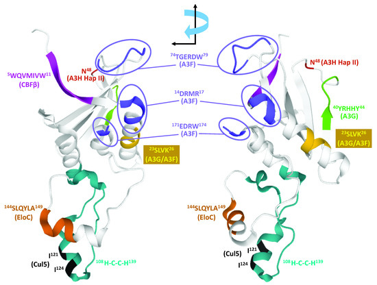 Domains of Vif involved in interactions with A3 proteins and CRL5 E3 ubiquitin ligase. Only the structure of Vif, in complex with CBFβ, Cul5, and EloB/C, is shown (PDB: 4N9F). Residues involved in interactions with A3 proteins are shown using Rasmol software (www.rasmol.org). Residues involved in interaction with A3F, A3G, and A3H hap II are shown in purple, green, and red, respectively. Residues that are involved in interaction with both A3G and A3F are shown in gold. Residues involved in interactions with CBFβ, EloC, and Cul5 are shown in magenta, brown, and black, respectively.