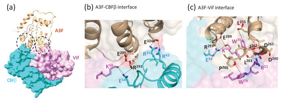A cryogenic electron microscopy (cryo-EM) structure of a ternary complex consisting of Vif, CBFβ, and A3FCTD at 3.9 Å resolution was recently reported [123], providing the first structure of a Vif-A3 complex. As discussed earlier, the Vif-CBFβ interaction was thought to facilitate Vif-mediated degradation of A3 proteins by primarily inhibiting degradation of Vif and increasing its steady-state levels. Furthermore, it was thought that Vif binding to CBFβ partially blocks A3 binding and that CBFβ must be displaced before Vif can bind to A3 proteins [139,186]. It was therefore surprising that binding to A3FCTD did not significantly alter the conformation of the Vif-CBFβ complex. Additionally, it was found that CBFβ directly interacts with A3FCTD and participates in the recruitment of A3FCTD to the Cul5 E3 ubiquitin ligase complex (Figure 5a).