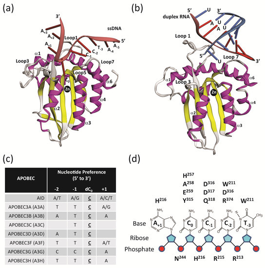 - Kohli, R.M.; Abrams, S.R.; Gajula, K.S.; Maul, R.W.; Gearhart, P.J.; Stivers, J.T. A portable hot spot recognition loop transfers sequence preferences from APOBEC family members to activation-induced cytidine deaminase. J. Biol. Chem. 2009, 284, 22898–22904. [Google Scholar] [CrossRef]
