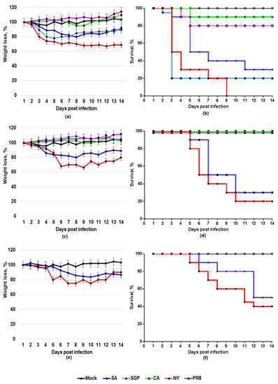 Mice were intranasally inoculated with a 10-fold serial dilution of each virus in PBS under general anesthesia with ether. The weight changes and survival rates were monitored daily for two weeks. The results are summarized in Table 2 and Figure 3. The viruses differed in the main characteristics of pathogenicity being tested in the mice. As shown in the section “acute toxicity in mice”, the toxic action of the intranasally inoculated mouse-adapted PR8 influenza virus killed mice within the first 3–4 days. As can be seen from Figure 3, the second peak of late deaths occurred at 6–10 days post infection and was due to pulmonary consolidation and primary viral pneumonia. Interestingly, non-mouse-adapted SA was also shown to be pathogenic to mice.