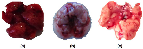 Gross examination of the lungs of mice infected with A/South Africa/3626/2013 (H1N1)pdm09 influenza virus: (a) hemorrhagic pulmonary edema (8.2 log10 EID50/mouse, D4); (b) primary viral pneumonia (1 PnD50/mouse = 5.0 log10 EID50/mouse, D14); (c) normal lungs of a control mouse inoculated with phosphate-buffered saline (PBS) (D14).