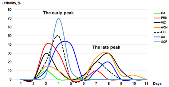 In our experiments, the toxic effects of the intranasally inoculated lung-adapted PR8 influenza virus killed mice within the first 3–4 days. After these toxic deaths, the second peak of late deaths was detected at 6–10 days and was due to primary viral pneumonia. These results correspond to early publications [51]. Conversely, only one peak of early deaths (D2–D4) was seen after the inoculation of mice with non-mouse-adapted viruses. Ninety percent and 80% of the mouse deaths were recorded in the first 4 days post-intranasal inoculation with the non-mouse-adapted SGP and SA, respectively.