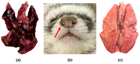 Nasal symptoms and gross examination of the lungs of the ferrets infected with A/South Africa/3626/2013 (H1N1)pdm09 influenza virus. (a,b) The ferrets were inoculated with 6.0 log10 EID50. (a) Severe lung lesions were registered on day 4 post infection. (b) On D3 post infection, the animals displayed sneezing, nasal discharge on the external nares (red arrow) and mouth breathing. (c) In contrast, the lungs of the ferrets inoculated with PBS were normal.