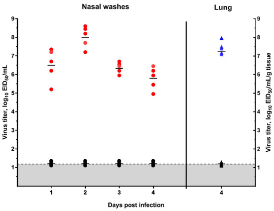 Red circle—virus titer in the nasal washes of the infected ferrets; blue triangle—virus titer in the lung tissue of the infected ferrets; black circle—virus titer in the nasal washes of the ferrets inoculated with PBS; black triangle—virus titer in the lung tissue of ferrets inoculated with PBS; gray—the limit of virus detection (1.2 log10 EID50/mL).