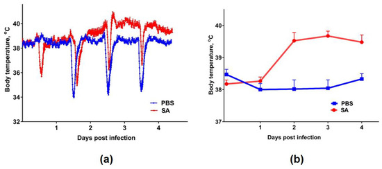 The body temperature of the ferrets was recorded on days 0–4 every 10 min (Figure 6a). A significant rise in body temperature (1.5–2 °C, average 40 °C) was seen in the animals after the inoculation with SA influenza virus compared with the control group, which was administered PBS (Figure 6b). These data confirm the development of the disease in the inoculated animals.