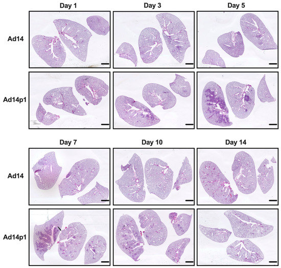 Effects of Ad14 and Ad14p1 on Syrian hamster lung pathology. H&E staining of Syrian hamster lungs post infection with 5 × 109 genomes/animal via intratracheal instillation. Slides were scanned with Pathscan Enabler IV at 3600 dpi (Meyer Instruments, Houston, TX, USA) and are representative of four hamsters. Bar = 1 mm.