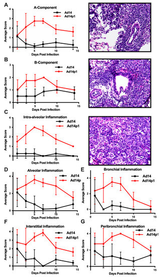 Intensity of Ad14 and Ad14p1 induced lung inflammation. H&E sections from Ad14- and Ad14p1-infected hamsters were scored by a pathologist for inflammation based on the lung allograft rejection scoring standards for (A) A-component and (B) B-component. H&E sections from Ad14- and Ad14p1-infected hamsters were scored from the same slides by a pathologist according the guidelines described in the methods section to determine regional pneumonitis: (C) Intra-alveolar (D) alveolar, (E) bronchial, (F) interstitial, and (G) peribronchial inflammatory scores. H&E sections from an Ad14p1-infected hamster at day 5 post infection. Representative 40× images of (A) Grade A3, A-component score, (B) high-grade B-component score, and (C) G3 intra-alveolar score. n = 4, Mean ± SD.