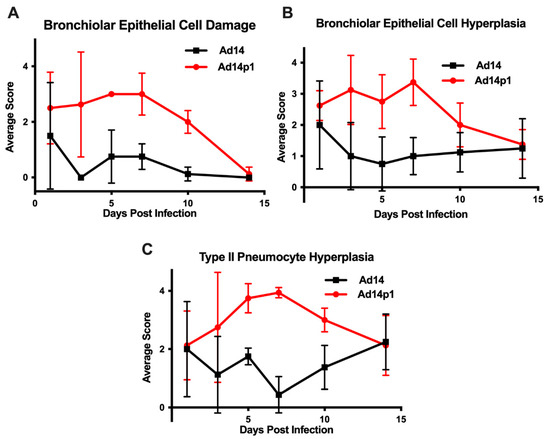 Effects of Ad14 and Ad14p1 on hamster lung cells. Airway epithelial cell changes were assessed by evaluating (A) bronchiolar epithelial cell damage, (B) bronchiolar epithelial cell hyperplasia, and (C) Type II pneumocyte hyperplasia. Scoring criteria are explained in the methods section. n = 4, Mean ± SD.
