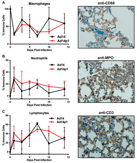 It was noted that the infiltrating inflammatory cells appeared to be primarily mononuclear cells. However, due to the thickness of the sections and the inflammatory cell density in the localized areas of pneumonia, it was difficult to determine differential counts of inflammatory cell types (Figure 2A, photo). Therefore, thinner sections were made and differential cell (macrophage, neutrophil, and lymphocyte) counts were done at the periphery of the inflamed zones. The inflamed zones in both Ad14- and Ad14p1-infected hamsters show a mixed leukocyte infiltration consisting of macrophages (Figure 4A), neutrophils (Figure 4B), and lymphocytes (Figure 4C). Immunohistochemistry was done to confirm the presence of macrophages using anti-CD68 (Figure 4A, photo), neutrophils using anti-MPO (Figure 4B, photo) and T-cells using anti-CD3ε (Figure 4C, photo). There was little difference in the timing of leukocyte infiltration in animals infected with the two viruses, but rather it was the intensity of leukocyte infiltration that was different between Ad14- and Ad14p1-infected hamsters.
