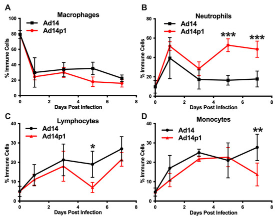 Effects of Ad14 and Ad14p1 on inflammatory cell composition of bronchoalveolar lavage (BAL) fluid. Syrian hamsters were infected with 5 × 109 genomes/animal via intratracheal instillation. BAL was performed on the days indicated, and cytospins were performed to determine differential cell counts. Macrophages (A), neutrophils (B), lymphocytes (C), and monocytes (D) are expressed as the percentage of total inflammatory cells (mean ± SEM). A one-way ANOVA was performed with p-values determined by a post-hoc Sidak test (n = 4, *** p < 0.001, ** p < 0.01, * p < 0.05).