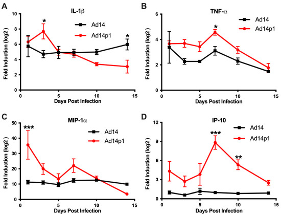 Cytokine expression in the lungs during Ad14 and Ad14p1 infection. (A) IL-1β, (B) TNF-α, (C) MIP-1α, and (D) IP-10 gene expression were determined by RT-qPCR of RNA from one of the right lung lobes of infected hamsters at the indicated times post infection. Fold change was determined by normalizing to RPL-18 expression and then by the 2 ΔΔCt method against uninfected control animals. Mean ± SEM, n = 4, one-way ANOVA followed by Holm–Sidak (*** p < 0.001, ** p < 0.01, * p < 0.05).