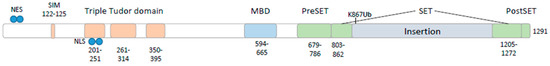 Protein domain structure of SETDB1. The human SETDB1 protein (1291 amino acids, 143 kDa) contains triple Tudor domains (TTDs) and a methyl-CpG binding domain (MBD) in its N-terminal part, followed by a split SET domain (pre-SET, SET, and post-SET). The TTDs bind to histone H3 tails that have been modified by K14 acetylation combined with K9 methylation. The C-terminal region containing the pre-SET, SET, and post-SET domains is responsible for H3K9 specific lysine methylation [21,24]. The SET domain of SETDB1 has a long insertion, which is monoubiquitinated by UBE2E enzymes independent of E3 ligase (on K867 in human or K885 in mouse), and this monoubiquitination highly enhances the methyltransferase activity of SETDB1 [39,40]. At the N-terminal region of SETDB1, there is a functional SUMO interacting motif (SIM) [41] in close proximity to a nuclear export signal (NES) and a nuclear localization signal (NLS) [42].