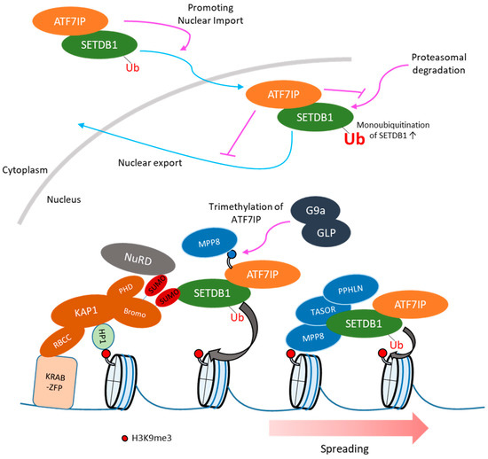 SETDB1 recruitment and H3K9me3 spreading. SETDB1 is mainly localized in cytoplasm and nuclear SETDB1 is degraded by proteasomal pathway [65]. ATF7IP promotes nuclear import of SETDB1 and inhibits nuclear export and proteasomal degradation of SETDB1 [70]. In addition, ATF7IP-mediated SETDB1 nuclear accumulation enhances its ubiquitinated, enzymatically more active form [70]. SETDB1 interacts with SUMOylated KAP1 and is recruited to retroelement by KRAB-ZFP/KAP1 pathway, then SETDB1 mediates H3K9me3 in retroelement [41]. The Human Silencing Hub (HUSH) component bind H3K9me3 via chromodomain of MPP8, which might require for H3K9me3 spreading [76]. ATF7IP harbors H3K9-like sequence, which is methylated by G9a/GLP. The methylation of ATF7IP is recognized by MPP8 and the residue methylated by G9a/GLP is required for efficient provirus silencing [77]. The HUSH complex might be recruited to SETDB1 target via interaction between methylated ATF7IP and MPP8.