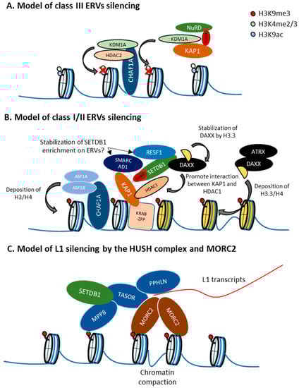 CHAF1 complex: In mESCs, CHAF1A/B represses a larger number of class III than class I/II ERVs. CHAF1A-targeted class III ERVs are not marked with H3K9me3, but instead are enriched in H3K4me2 and H3K27Ac, which are targets of histone demethylase KDM1A and histone deacetylase HDAC2. CHAF1A-targeted class III ERVs are also enriched in both these enzymes, which interact with CHAF1A. On the other hand, CHAF1A targeted class I/II ERVs with high H3K9me3 levels are not enriched in KDM1A/LSD1 and HDAC2. CHAF1A depletion results in increased H3K4me3 and H3 acetylation of CHAF1A-targeted class III ERVs. CHAF1A represses ERVs also by cooperating with KAP1 to increase the levels of H3K9me3 in class I and II ERVs. In addition, CHAF1 depletion results in a significant increase of active chromatin modification in proviruses, whereas H3K9me3 is only slightly decreased. Thus, CHAF1A regulates class I/II and III ERVs by different mechanisms through interactions with distinct co-factors [111] (Figure 3A,B).