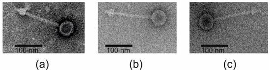 A 3 µL drop of purified high-titer (1010–1013 PFU/mL) phage in 0.1 M ammonium acetate, pH 7.0, concentrated using a 105 Da cut-off Vivaspin ultrafiltration (Minisart® Sartorius), was deposited on carbon-coated 400 mesh copper grid and allowed to adsorb for 1 min, followed by 2% uranyl acetate for 30 s []. Samples were examined with a JEOL JEM-1400 transmission electron microscope JEOL Ltd., Tokyo, Japan) under 80 kV at the electron microscopy unit (Institute of Biotechnology, University of Helsinki, Helsinki, Finland). Pictures were taken using Gatan Orius SC 1000B bottom-mounted charged coupled device (CCD)-camera (Gatan Inc., Pleasanton, CA, USA). The dimensions of at least 10 phage particles measured to calculate the average and standard error values.