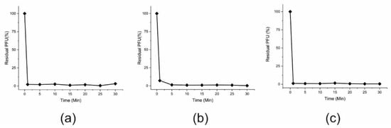 Adsorption curves of fEg-Aba01 (a), fLi-Aba02 (b), and fLi-Aba03 (c) to A. baumannii #6597. The phage titer in the control supernatant was set to 100% and the residual titers at different time points were related to that. Each assay was performed in duplicate and repeated for 3 times. Note that the standard deviation bars are mostly hidden behind the symbols.