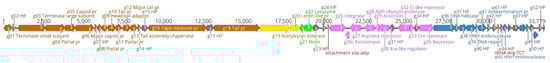 Annotation of the sequences showed that fEg-Aba01 consisted of 52, fLi-Aba02, of 53, and fLi-Aba03, of 54, predicted genes (Table 1 and Table S3). Seven of the genes in each were encoded in the reverse strand. The GC contents of the phages were similar, 40.1–40.2% (Table 1) that is very close to the GC content of A. baumannii host, ca. 39% []. The overall organization of the genome of fEg-Aba01 is presented in Figure 4.