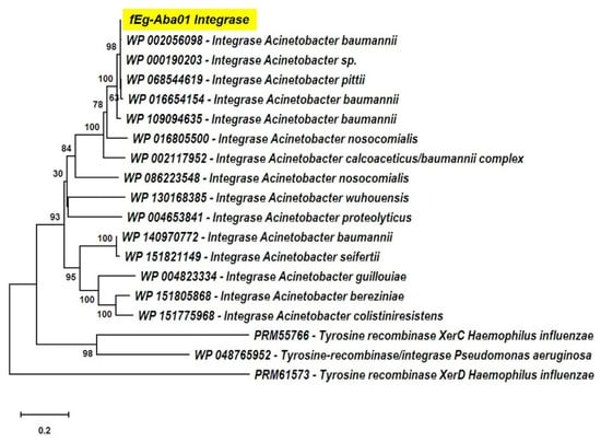 Figure 5. The phylogenetic tree of fEgAb01 integrase with different site-specific Acinetobacter integrases and rooted with the Haemophilus influenza and Pseudomonas aeruginosa integrases. The tree was constructed using the MEGA X neighbor-joining statistical tree analysis method with bootstrapping set to 1000 tree branches are proportional to branch lengths. The branch labels represent bootstrap values. The integrase of fEg.Aba01 is highlighted in yellow. - The DNA synthesis, regulation and replication gene products include the Xre family transcriptional regulator (Gp30c; Gp32c), the DNA helicase (Gp36; Gp38) that unwinds the DNA to create template for DNA replication [], and another repressor (Gp35; Gp37) likely involved in gene regulation. The putative HNH endonucleases (Gp38, Gp45 and Gp51; Gp40, Gp47 and Gp53) may play a variety of roles in replication, recombination, and repair pathways []. Finally, the antiterminator protein (Gp41; Gp43) renders RNA polymerase resistant to termination signals [].