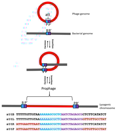 Temperate phages which enter lysogeny maintain a long-term association with their host bacteria if they produce a mutually beneficial interaction that support efficient reproduction of both phages and bacteria []. The phages integration into the host genome is a crucial step in the lysogenic cycle and is mediated by the integrase protein, a DNA recombinase encoded by bacteriophages, at a distinct bacterial genome attachment site (attB), which is identical to an attachment site (attP) of the prophage genome []. Prophages do not integrate randomly into the host genomes. For example, prophages encoding a tyrosine integrase are usually integrated next to their host tyrosine tRNA gene and the palindromic structures of those temperate phages allow their integration within the bacterial genome [].