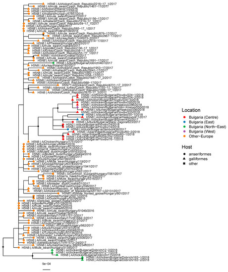 Chicago/Turabian StyleVenkatesh, Divya, Adam Brouwer, Gabriela Goujgoulova, Richard Ellis, James Seekings, Ian H. Brown, and Nicola S. Lewis. 2020. "Regional Transmission and Reassortment of 2.3.4.4b Highly Pathogenic Avian Influenza (HPAI) Viruses in Bulgarian Poultry 2017/18" Viruses 12, no. 6: 605. https://doi.org/10.3390/v12060605