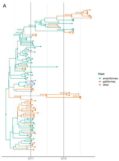 2.4. Spatial Phylodynamic Analysis and Ancestral Host Reconstruction