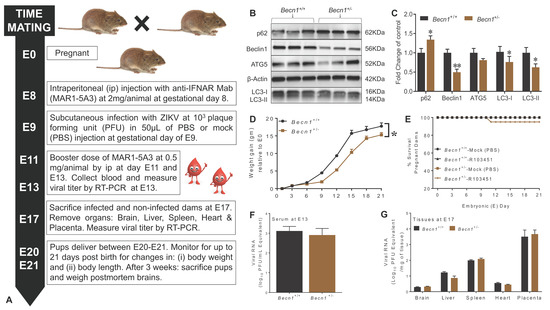 3.1. Transiently Immunosuppressed Pregnant Becn1+/+ and Becn1+/− Dams Are Susceptible to ZIKV Infection