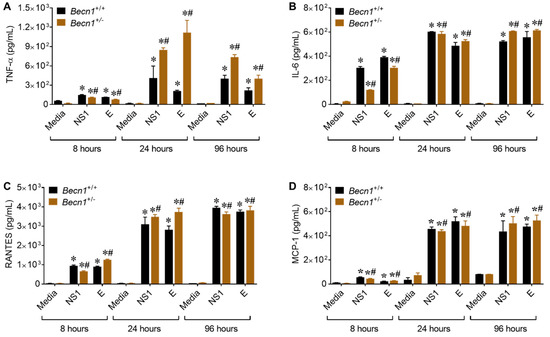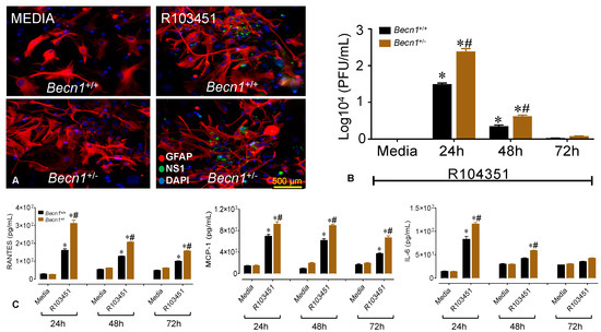 3.4. Reduced Beclin1 Exacerbates Secretion of Inflammatory Molecules in ZIKV-Infected Glia In Vitro