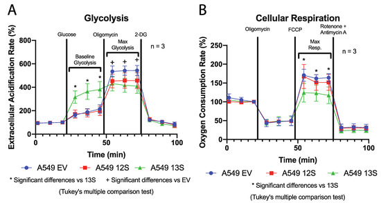 A549-13S cells have a unique functional glycolytic and oxidative phosphorylation metabolism when compared to A549-12S and A549-EV cells. (A) Seahorse XFe24 assay of extracellular acidification rates, a readout of glycolysis. Extracellular acidification rates were highest in A549-13S cells after addition of glucose, which is a reflection of the baseline glycolytic rate after stimulation. However, A549-EV cells had the highest maximum extracellular acidification rates after addition of oligomycin, which forces maximal glycolysis by inhibition of ATP synthase. There were no differences in response after the addition of 2-deoxyglucose (2-DG) to shut down glycolysis and end the experiment. * = p < 0.05 in a comparison between A549-13S and either A549-12S or A549-EV cell lines. + = p < 0.05 in a comparison between A549-EV and either A549-12S or A549-13S cell lines. (B) Seahorse XFe24 assay of oxygen consumption rates, a readout of oxidative phosphorylation. The amount of cellular respiration dedicated to ATP production was no different between the cell lines as indicated by oligomycin treatment. Maximal oxygen consumption rates, induced by carbonyl cyanide-4-(trifluoromethoxy)phenylhydrazone (FCCP) which decouples the mitochondria, were lowest in A549-13S cells. There were also no differences between the cell lines after the addition of rotenone and antimycin A used to terminate the experiment. * = p < 0.05 in a comparison between A549-13S and either A549-12S or A549-EV cell lines. 2-DG, 2-deoxyglucose; FCCP, carbonyl cyanide-4-(trifluoromethoxy)phenylhydrazone.